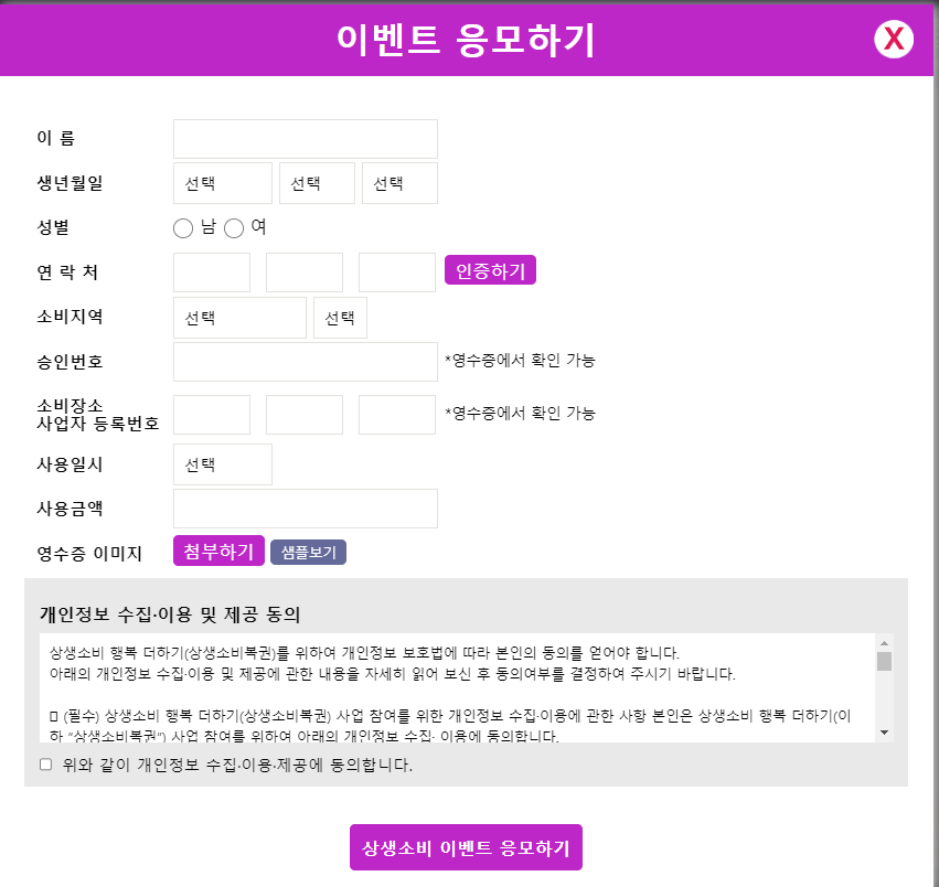 응모 홈페이지에 들어가서 응모하기를 클릭하게 되면 아래와 같은 화면이 나오고