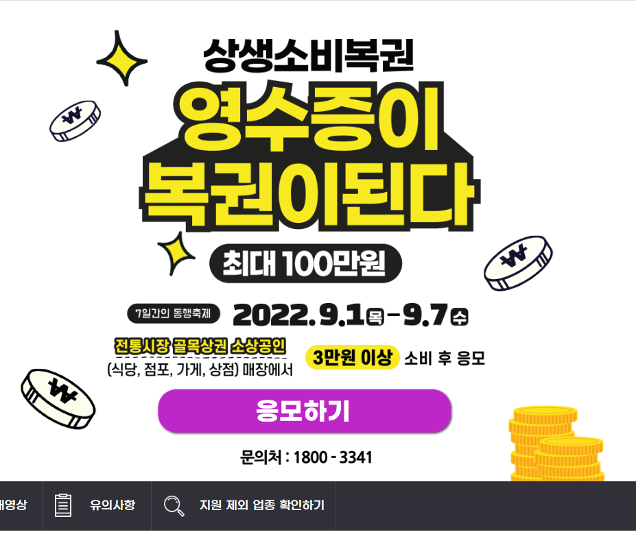 상생소비복권 홈페이지에 접속하여 응모하기를 클릭한다. 응모기간은 9월 1일(목) ~ 7일(수)까지이며 얼마남지 않은 기간동안 구매한 영수증으로 응모해야 한다. --> 상생소비복권 홈페이지 클릭